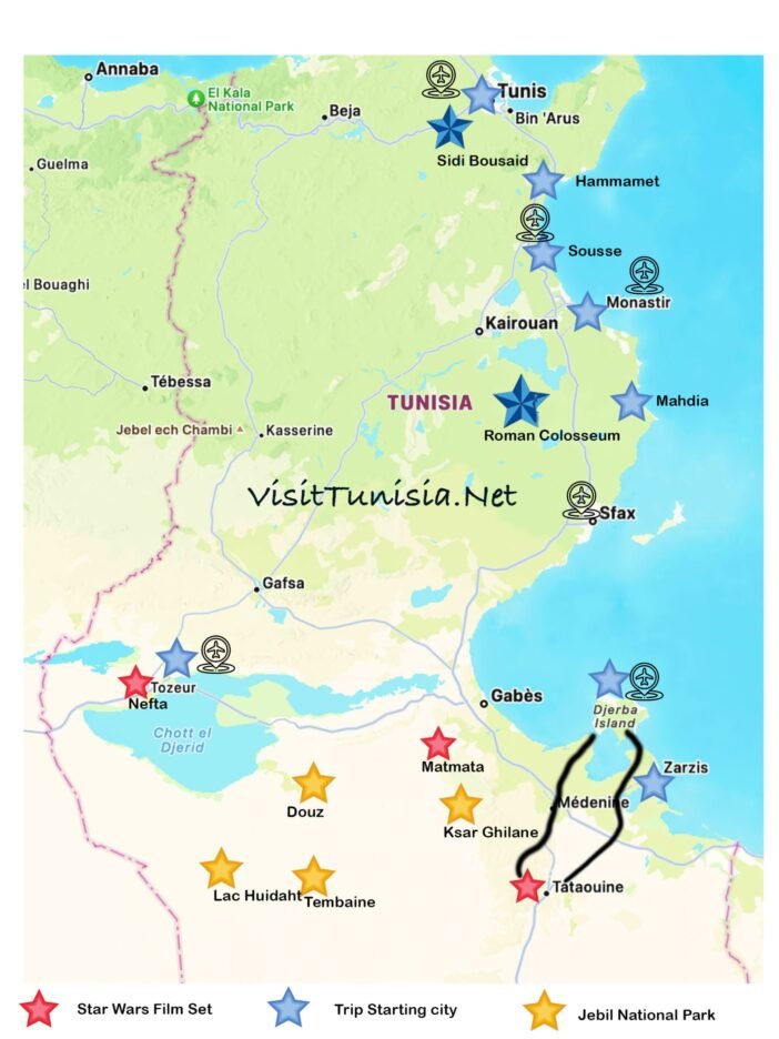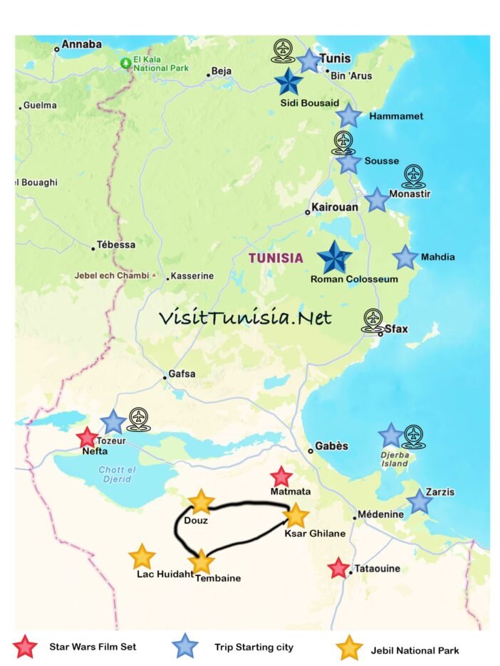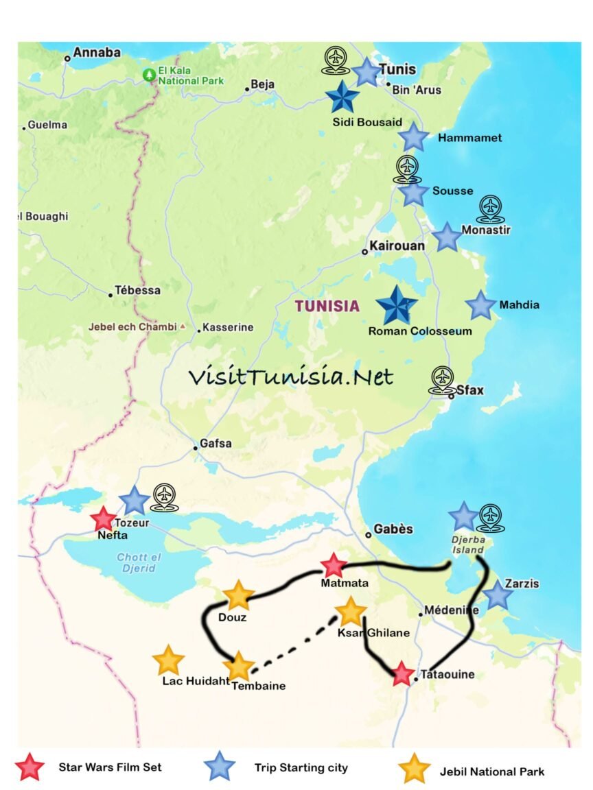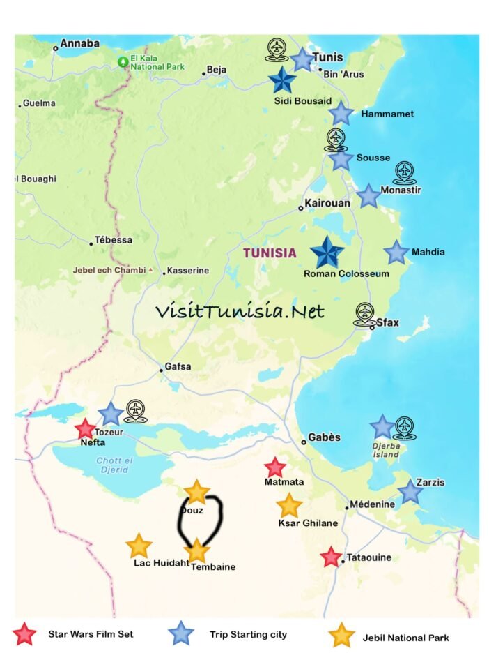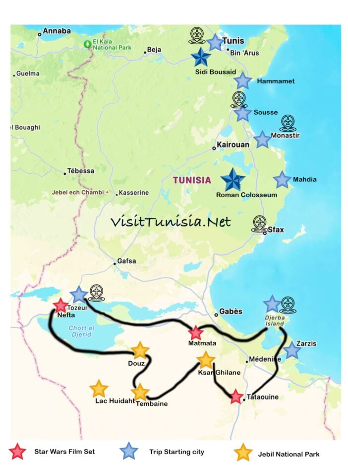 First Time Visiting Tunisia, we do Recommend the Grand Sud Tour. includes Star Wars movies Set, Berber Cities, Oasis and Sahara. its can be done in 4 Days Plan or 7 Days if you wanna explore More